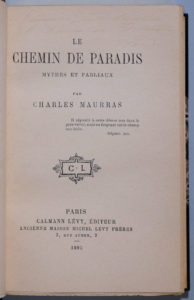 MAURRAS (Charles). Le chemin de Paradis. Paris, Calmann-Lévy, 1895. In-12, 325 p., demi-maroquin bleu nuit à coins, dos à 5 nerfs, auteur, titre et date dorés, tête dorée, couverture conservée [J.-P. Miguet]. Édition originale du premier...