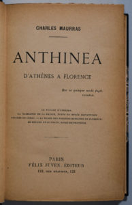 MAURRAS (Charles). Anthinéa. D'Athènes à Florence. Paris, F. Juven, [1901]. In-12, 340 p., demi-maroquin bleu nuit à coins, dos à 5 nerfs, auteur et titre dorés, filet doré aux plats, tête dorée, non rogné, couverture et dos conservés...