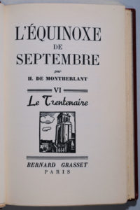 MONTHERLANT (Henry de). L'équinoxe de septembre. Paris, Grasset, (Le Trentenaire), 1938. In-12, 269 p., demi-chagrin bordeaux à bandes, dos lisse, auteur, titre et date dorés, filet doré aux plats, tête dorée, non rogné, couverture et dos...