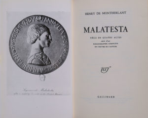 MONTHERLANT (Henry de). Malatesta. Pièce en quatre actes. Paris, Gallimard, 1948. In-12, 248 p., demi-maroquin bordeaux à bandes, dos lisse bordé d'un double filet doré, auteur, titre et date dorés, filet doré aux plats, tête dorée, non...