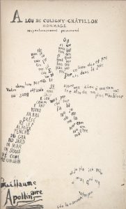 "Lou”, maitresse très éphémère du poète mais sans doute le plus grand amour de sa vie, portant cet envoi autographe signé : A LOU DE COLIGNY-CHATILLON HOMMAGE respectueusement passionné Guillaume Apollinaire qui a dessiné à la suite un très beau calligramme en forme de palmier à cinq palmes dont voici le texte : Je vous salue Lou comme fait votre arbre préféré le palmier du grand jardin marin soulevé comme un sein Votre chevelure pareille au sang répandu Mourir et savoir enfin l'irrésistible Eternité Oliviers vous battiez ainsi que font parfois ses paupières Par ce livre dur et précis dans la joie apprenez à Lou à me connaìtre afin de ne plus m'oublier Et en forme de creur : mais perché sur l'abìme je domine la mer comme un maitre et je place ici même malgré vous votre pensée la + secrète. L'envoi est reproduit dans Ombre de mon amour (Poème II).