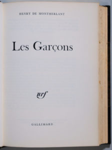 MONTHERLANT (Henry de). Les garçons. Paris, Gallimard, 1969. In-8, 377 p., demi-maroquin à longs grains noir et à coins, nom de l'auteur sur une pièce noisette, titre sur une pièce vert empire, tête dorée, non rogné, couv. et dos conservés...