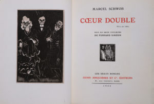 SIMÉON. SCHWOB (Marcel). Coeur double. Paris, Jonquières (Les beaux romans), 1925. In-8, 299 p., demi-maroquin prune à bandes, dos lisse, auteur, titre et date dorés, filets dorés aux plats, tête dorée, couv., dos et témoins conservés...