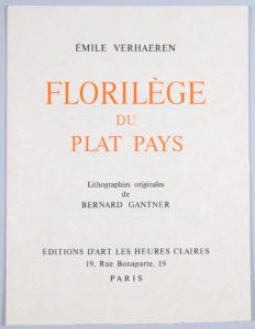 GANTNER. VERHAEREN (Émile). Florilège du plat pays. Paris, Les Heures Claires, 1969. Grand in-4, en feuilles sous couv. rempliée et emboîtage éditeur. Ouvrage illustré de 19 lithographies originales en couleurs de Bernard Gantner. Tirage...