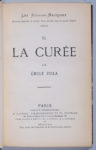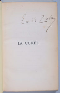 couverture conservée [Semet et Plumelle]‎. Édition originale du deuxième volume de la série des Rougon-Macquart. Il n'a pas été tiré de grands papiers. Comme toujours la couverture porte la date de 1872. Signature autographe d'Emile Zola qui suit un envoi effacé. (Carteret II, 480).