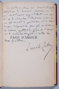 couverture conservée [Devauchelle]‎. Huitième volume de la série des Rougon-Macquart, illustré d'une planche montrant l'arbre généalogique des Rougon. Collation conforme à l'édition originale parue en 1878 (sauf le dernier f. blanc non conservé) ; mention de 34e édition au titre ; la couverture (peut-être rapportée) datée de 1881 porte une mention de 43e édition. 9 lignes autographes et signées d'Émile Zola couvrent la moitié du faux-titre ; l'auteur reproduit les premières lignes du chapitre 1 : « La veilleuse dans un cornet bleuâtre…etc. ». Un portrait de Zola (coupure de presse a été inséré avant le titre. (Carteret II, 482 pour l'E.O).