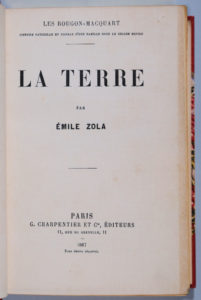 ZOLA (Émile). La terre. Paris, Charpentier, 1887. In-12, 519 p., demi-maroquin corail à coins, tête dorée, dos lisse orné de quatre caissons à losanges et semés de points dorés, pièce de titre noire, tête dorée, non rogné, couverture...