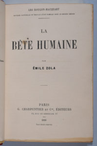 ZOLA (Émile). La bête humaine. Paris, Charpentier, 1890. In-12, [2] f., 415 p., 8 p. (catal. édit.), demi-maroquin corail à coins, tête dorée, dos lisse orné de quatre caissons à losanges et semés de points dorés, pièce de titre noire,...