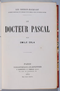 ZOLA (Émile). Le docteur Pascal. Paris, Charpentier et Fasquelle, 1893. In-8, [4] f. (1 bl., fx-titre, titre, « A la mémoire... »), 390 p., [1] f. (annonce), 1 pl. dépl., demi-maroquin corail à coins, tête dorée, dos lisse orné de quatre...