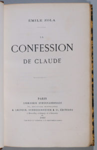 ZOLA (Émile). La confession de Claude. Paris, ‎Librairie internationale, A. Lacroix, Verboeckhoven et Cie, 1866. In-12, [2] f., 320 p., demi-maroquin à longs grains havane, dos lisse orné de fers romantiques dorés et de petits fleurons noirs,...