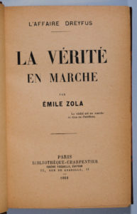 ZOLA (Émile). L'affaire Dreyfus. La vérité en marche. Paris, Charpentier, 1901. In-12, [2] f., IV-314 p., [1] f. (table), demi-chagrin havane à coins, dos à 4 nerfs, auteur, titre et date dorés, tête dorée, non rogné, couverture conservée...