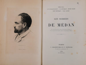 ZOLA (Émile), MAUPASSANT, HUYSMANS [Et al.]. Les soirées de Médan. Paris, Charpentier, 1890. In-8, [3] f., 300 p., [2] f. (le dernier blanc), demi-maroquin grenat à coins, dos à 5 nerfs orné de fleurons et filets entrelacés dorés, filet doré...