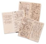 7 cahiers manuscrits, de différentes mains, dont celle de la duchesse de Berry (plus de 50 p.), contenant des citations, poèmes, études de mathématiques, religion, souvenirs de voyages de la duchesse, etc. En français et en italien. In-4 ou in-8. Maroquin ou demi-maroquin, rouge, vert, bleu ou fauve, dont quatre volumes à ses armes (une reliure signée de Simier).