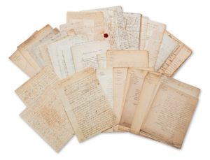 [A] Correspondance au docteur Prosper Ménière. Environ 90 lettres (quelques unes de la main du médecin). Ménière fut envoyé à Blaye par le gouvernement pour surveiller la santé de la duchesse de Berry. ARGOUT, Antoine comte d', ministre de l'Intérieur : 16 lettres signées, 1833. Interrogation sur la grossesse de la duchesse, envoi du Dr. Dubois à Blaye, décision de la duchesse de nourrir son enfant, etc. ─ ORFILA, Mathieu : 9 documents dont un rapport autographe confidentiel, 3 février 1833, sur "les présomptions physiques et morales qui peuvent nous porter à penser que Madame la Duchesse de Berry se trouve enceinte", alors qu'elle s'est refusée par trois fois à tout examen physique ; et 8 lettres autographes signées, mars et mai 1833, relatives à la captivité de la duchesse, ses maladies passagères, une saignée, le constat d'une grossesse incontestable, "le ballottement le prouve", débat de compétence pour assister l’accouchement, etc. ─ SAINT-ARNAUD, Armand de : 2 lettres autographes signées, à propos du mécontentement du général Bugeaud après les indiscrétions de Ménière publiées dans les journaux. ─ MAILLÉ D'HAUTEFORT, Adèle de : lettre autographe signée et billet au crayon : "Madame désire qu'il soit ajouté à la dépêche télégraphique concernant Mme de Castéja que S.A.R. ne devant pas partir avant le 3 juin Mme de Castéja peut arriver à Blaye jusqu'à ce jour". ─ BERRY, duchesse de : enveloppe autographe à Bugeaud. ─ Rauté (10 lettres, Paris et Sceaux). ─ Mme E. Maillard. ─ Dr. Adolphe Lachèze (4 lettres). ─ J. Bodey. ─ FELTRE, Alphonse de, envoyant à la duchesse de la musique pour "contribuer à la distraire un instant dans sa triste captivité". ─ Dr. Leloutre. ─ Veuve Dubray. ─ Dr. BRICHETEAU, sur la naissance de l'enfant de la duchesse et du "coupable". ─ M. de Meinard (entomologie). ─ Junior Caussade. ─ Victor Bodinier. ─ Gouin, avocat (plus une lettre avec signature arrachée). ─ BUGEAUD, Thomas, gouverneur de la citadelle de Blaye : 7 lettres autographes signées et une lettre signée à divers correspondants. Il se moque de "la déconfiture du pauvre docteur accoucheur de S.A.R." et s'étonne des nouvelles menaces prononcées par la duchesse et par "ses imbéciles et incorrigibles partisans" prêts à se rallier "sous son drapeau prostitué", etc. ─ Joséphine Guinoyseau, à Bugeaud, le priant de proposer ses services à la duchesse. ─ AUVITY, Pierre, médecin de Charles X : lettre autographe signée, 15 février 1833. Il insiste sur l'importance de la mission de Ménière : "je vous demande pour elle tous les égards et tous les ménagements que sa situation exige et devra vous inspirer". ─ SCHEDEL, Henri, médecin et dermatologue : 3 lettres autographes signées, sur les calomnies qui circulent dans le milieu légitimiste sur la non-grossesse de la duchesse. ─ DUBOIS, Antoine, chirurgien qui avait été l'accoucheur de Marie-Louise et que détestait la duchesse de Berry. ─ DUBOIS, Paul, obstétricien : 2 lettres sur "l'accouchement de la captive si elle reste à Blaye". ─ GINTRAC, Élie. ─ DENEUX, Louis-Charles, médecin accoucheur. ─ MÉNIÈRE, Prosper : 7 lettres à son père et sa sœur Clémence. Blaye, février-juin 1833, évoquant son quotidien auprès de la duchesse de Berry et 6 lettres de Clémence Ménière à son frère.
