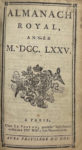 ALMANACH ROYAL, — année 1775. Paris, Le Breton, [1775]. – Calendrier de la Cour. Paris, Ve Hérissant, 1775. – Extrait de l'état militaire, pour l'année 1775. Paris, Guillyn, [1775]. – Étrennes mignonnes, curieuses et utiles. Paris, Durand, 1775.