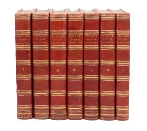 Amsterdam, J. E. G. Dufour, 1799. 7 volumes in-4, maroquin rouge à long grain, grecque dorée sertie de filets en encadrement, dos orné de filets et guirlandes dorés, guirlande intérieure, tranches dorées (Reliure de l'époque).Édition en partie originale, la plus complète et la dernière préparée par l’auteur.