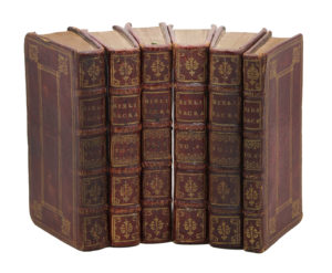 Cologne, Jacobus Naulæus, 1677-1679. 6 volumes in-24, maroquin rouge, décor à la Du Seuil, dos orné, dentelle intérieure, tranches dorées (Reliure de l'époque).Jolie et rare édition en petits caractères de la vulgate, ornée de six titres-frontispices gravés en taille-douce (dont un titre-frontispice général relié en tête du dernier volume), copiés sur ceux de l’édition de Cologne et Paris, 1670.