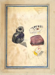 le blanc et le noir, le poète a représenté en une nature morte, divers objets familiers qui devaient se trouver sur sa table de travail : un encrier, un cendrier, un porte-monnaie et un paquet de tabac à pipe.