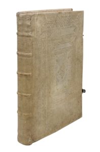 Bruxelles, Jean Léonard, 1729. In-folio, peau de truie estampée sur ais de bois, multiples encadrements de filets et de roulettes à froid, médaillon central, dos muet orné de roulettes à froid, tranches rouges, fermoirs de laiton ouvragé (Reliure de l'époque).Somptueux livre de fêtes commémorant la cérémonie funéraire donnée le 12 mars 1622, en l’église Sainte-Gudule de Bruxelles, en l’honneur de l'archiduc Albert d'Autriche (1559-1621), souverain des Pays-Bas à la suite de son mariage avec l'infante Isabelle d'Espagne.