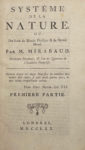1770. 2 volumes in-8, veau marbré, triple filet doré, dos orné, tranches rouges (Reliure de l'époque).Édition originale de la « bible du matérialisme », publiée par le baron d'Holbach sous le nom de Jean-Baptiste de Mirabaud. L'avis de l'éditeur est attribué à Naigeon.