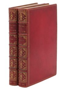 1762. 2 volumes petit in-8, maroquin rouge, triple filet doré, dos orné d'un fer à l'oiseau répété, dentelle intérieure, tranches dorées (Capé).Célèbre édition dite des fermiers généraux, parce qu'elle a été financée par ces puissants financiers dont l’influence était croissante depuis la Régence. « Parmi les livres illustrés du XVIIIe siècle, cette édition est celle dont l'ensemble est le plus beau et le plus agréable », écrit Cohen.