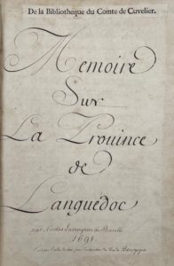 [MANUSCRIT] — LAMOIGNON DE BASVILLE (Nicolas de). Memoire sur la Province de Languedoc. [D'une autre main :] Par Nicolas Lamoignon de Baville. 1698. Fait par l’ordre du Roi pour l’instruction du duc de Bourgogne. S.l.n.d. [vers 1698].