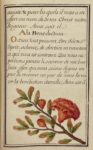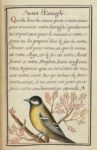 Le texte, calligraphié en rouge et noir dans un cadre de filets, est orné de 19 très jolis dessins originaux en couleurs, non signés, représentant des mésanges et autres petits oiseaux, des insectes (une guêpe, un papillon, une libellule, un scarabée), une plume multicolore, des fleurs, des fraises, des cerises, des paysages, etc.
