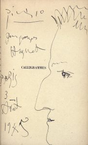 doublure et gardes de daim encadré d'un listel de box beige et d'un filet doré, filet doré sur les coupes, tête dorée, non rogné, couverture et dos, chemise et étui (Alain Devauchelle). Édition originale, ornée d'un portrait de l'auteur par Picasso gravé sur bois par R. Jaudon. Exemplaire enrichi d'un DESSIN ORIGINAL À LA PLUME DE PICASSO REPRÉSENTANT APOLLINAIRE DE PROFIL, à pleine page, accompagnant cet envoi : Picasso pour Georges Hugnet Paris 3 aout 1945