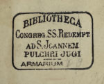 Ex-libris manuscrit ancien sur le titre et cachet de bibliothèque rédemptoriste sur une garde : Bibliotheca congreg. ss. redempt. ad S. Joannem Pulchri Jugi. Menus défauts à la reliure, coiffe de tête légèrement enfoncée.