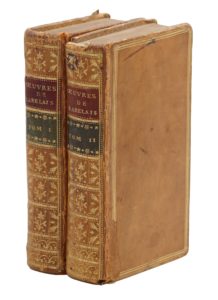 1663. 2 volumes in-12, veau glacé, double filet d'encadrement, dos orné, tranches dorées (Reliure du XVIIIe siècle).Première édition elzévirienne, accompagnée d'une vie de l'auteur et de notes attribuées à Pierre Dupuy et d'un lexique rabelaisien intitulé Alphabet de l'auteur François.
