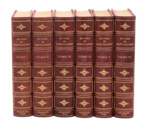 Paris, Crapelet, 1822. 6 volumes in-8, demi-maroquin grenat avec coins, double filet doré, dos orné, tête dorée, non rogné (Zaehnsdorf).Nouvelle édition, précédée d'une Notice sur la vie et les ouvrages de Destouches attribuée à Senonnes et ornée d'un portrait gravé par Macret d'après Choquet.