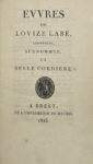 Après 1578, la Belle Cordière n'avait plus connu les honneurs de la presse qu'en 1762. Cette édition brestoise a été collationnée sur les trois principales éditions collectives, l'ode grecque de 1555, supprimée en 1556, a été rétablie et les Recherches sur la vie de l'auteur, rédigées par C.-J. de Ruolz pour l'édition de 1762, sont reproduites en tête du volume.