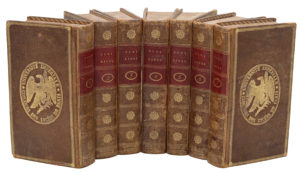 On joint deux livres de prix du Lycée Napoléon (actuel Lycée Henri-IV à Paris) : VALÈRE MAXIME. Dictorum factorumque memorabilium libri novem. Strasbourg, Imprimerie de la Société bipontine, 1806. 2 volumes in-8, veau raciné, roulette dorée, étoiles dorées aux angles, médaillon central comportant la mention : Prix du Lycée Napoléon, dos lisse orné, tranches marbrées (Reliure de l'époque). Bel exemplaire. – VIRGILE. Bucolica, Georgica, et Æneis. Paris, Herhan, 1806. In-12, veau raciné, roulette dorée, étoiles dorées aux angles, médaillon central comportant la même mention, dos lisse orné, tranches dorées (Reliure de l'époque). Exemplaire offert en premier prix de vers latins à l'élève Charles-Armand Pillault-Laboissière, avec ex-præmio daté 1810. Coiffes et coins usés, une charnière fendue, des rousseurs.