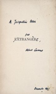daté décembre 1943 : à Jacqueline Bour pas [L'] ÉTRANGÈRe Albert Camus. Décembre 1943. Seuls les exemplaires du Service de Presse peuvent être considérés comme l'édition originale. Jacqueline Bour était secrétaire chez Gallimard. Personne ne savait montrer pour la littérature plus de considération ni plus de soin délicat, écrira d'elle Jules Roy. Quelques rousseurs à la couverture, marquée d'un léger pli.