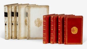 8 volumes in-12 et in-8 : - 4 volumes in-12 (170 x 100 mm). Maroquin rouge à long grain, roulette dorée en encadrement, armes dorées, doublure et gardes de tabis vert (Rosa, signature en pied du dos du 1er volume). - 4 volumes in-8 (220 x 136 mm). Vélin ivoire, roulettes dorées en encadrement, armes sur les plats supérieurs, dos lisse orné, tranches dorées (Bozerian, signature en pied du dos du 1er volume). Mors fragiles, vélin sali, rousseurs. Les livres de ce lot n'ont pas été collationnés / The books of this lot have not been collated.