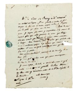 DECAZES, Élie. Lettre autographe signée au Chancelier de France [Charles-Henri Dambray, ministre de la Justice]. A l’opéra à 5 h. du matin [14 février 1820] (1 p. in-4, adresse au verso). Petite déchirure par bris de cachet touchant 2 mots. Les derniers instants du duc. Une heure avant le décès, Decazes annonce à Dambray que le blessé est sur le point de rendre l'âme, que le roi est attendu à l’opéra, toute la cour s’y trouvant déjà. Il enjoint le chancelier d’y venir également, de prévenir M. Cauchy [greffier de l’état civil de la maison royale], et convoquer la Chambre des Pairs. Decazes l’engage à venir chez lui dans la matinée, le roi désirant que les députés et les ministres s’y réunissent. Alors Président du conseil, Decazes sera soupçonné de complaisance envers les libéraux et donc complice de cet assassinat. Contraint de démissionner, il sera par la suite nommé ambassadeur en Grande-Bretagne. [On joint :] billet autographe signé, ce samedi, invitant un ami à dîner (1/2 page in-8).