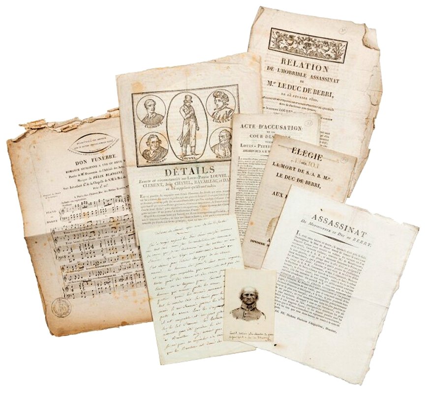8 pièces imprimées relative à l’assassinat du duc de Berry : ─ Assassinat de Monseigneur le Duc de Berry, Chinon, imp. Breton-Challuay an 1820. ─ Relation de l’horrible assassinat de Mgr le duc de Berri… ─ Élégie sur la mort de S.A.R. Mgr le duc de Berri dédiée aux Français, ─ Acte d’accusation de la Cour des Pairs contre Louis-Pierre Louvel…, Lille, Leleux, 1820. ─ Détails exacts et circonstanciés sur Louis-Pierre Louvel, Jacques Clément, Jean Chatel, Ravaillac et Damiens… Paris, V. Renaudière [1820]. ─ Don funèbre. Romance sicilienne… par Félix Blangini (2 pages de musique avec paroles). ─ Aux Mânes de son Altesse Royale Monseigneur le Duc de Berri par Martorey.