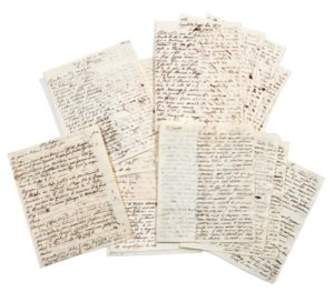 [Voyage dans l’ouest et le sud de la France : Nantes, Bourges, Bordeaux, Barèges, Bagnères, Pau, Auch, Toulouse, etc]. Ensemble comportant : manuscrit autographe fragmentaire. 77 pages in-4, sur une colonne avec ajouts et corrections en regard ; paginées de 13 à 101. Du [22] juin au 24 juillet [1828]. ─ [Pyrénées et autour]. Deux carnets autographes dont un débroché. Sans date, 57 et 85 p. in-12., au crayon à papier. Emploi du temps, rencontres, visites, comptes de dépenses, etc. ─ Lettre autographe signée. Rosny, 22 mai 1828. 1 page in-8. Elle annonce un voyage de trois mois et demi. ─ Quelques documents autographes épars.
