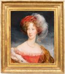 Il faut probablement dater cette toile des alentours de 1820-1822. Gérard semble en effet s’en inspirer très sensiblement lorsqu’il exécute, en 1822, son grand Portrait de la duchesse de Berry avec ses deux enfants (Versailles, musée national du château ; inv. MV 4799, voir ici même, lot 586), donnant au visage de la jeune femme une posture et une attitude quasi-similaires, mais cette fois-ci tournée vers la gauche.