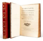 Paris, Clousier et Lamy, 1780-1786. 4 volumes grand in-folio (508 x 338 mm). Maroquin rouge, roulette dorée en encadrement, armes dorées au centre des plats, dos à nerfs orné de fers spéciaux (trophées de la peinture, de l’architecture et de la musique), roulette intérieure, tranches dorées ([Jean-Baptiste] Gosselin, étiquette à son adresse "41 rue Saint Jacques" contrecollée au verso du premier feuillet blanc). Rousseurs éparses et quelques feuillets uniformément brunis. Petit manque de papier dans la marge inférieure de la p. 81 de la table analytique. Quelques planches du premier volume de planches brunies. Planches 160, 169, 170 un peu plus courtes et 2 planches sur double page montées sur onglets dans le tome II de planches. Quelques feuillets brunis dans le second volume de texte. Quelques frottements et petites taches sur les plats. Importante éraflure sur le second plat du premier volume de planches.