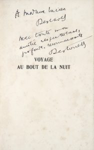 ARCHES, tirage estimé à 20 exemplaires, celui-ci hors commerce, enrichi de cet envoi : A Madame Lucien Descaves Avec toute mon amitié respectueuse, profonde, reconnaissante Destouches Françoise Descaves, née Embocheur, était l'épouse du romancier naturaliste Lucien Descaves (1861-1949), membre de l'Académie Goncourt et que Céline considérait comme son maitre. On sait que Descaves défendit vigoureusement, mais en vain, le Voyage au bout de la nuit pour le Prix Goncourt 1932. Après l'échec de Céline, il claqua la porte de l'Académie Goncourt et ne vota plus que par correspondance. Les exemplaires en grand papier avec envoi sont de la plus grande rareté.