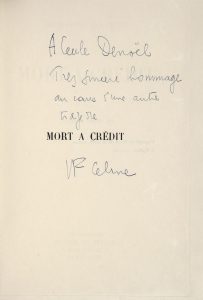 VI), NON CENSURÉS (seuls ces exemplaires hors commerce contiennent le texte intégral). Exemplaire imprimé spécialement pour Mme Robert Denoël. Il porte cet envoi autographe signé : à Cécile Denoël Très sincère hommage au cours d'une autre tragédie L F Céline L'Autre tragédie évoquée par Céline c'est le scandale provoqué par la noirceur du livre, sa grossièreté et par son style stupéfiant, et surtout pour lui par le lâchage des écrivains qui avaient soutenu Le Voyage, même Léon Daudet et Lucien Descaves, auquel est dédié Mort à Crédit. Sollicitant un article explicatif de Daudet, il lui écrit : 42 ans avant-hier, 32 ans d'angoisse, c'est peut-être marre. La critique a été immonde, droite ou gauche, je fais l'union et le summum de la haine envieuse, aveugle, de la hargne fumière. Que le monde change d'âme, je changerai de forme. J'écris dans la formule rêve éveillé. Le volume, en état parfait, est resté non coupé.