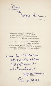 Blaise Cendrars. EXEMPLAIRE D'ÉPREUVES COMPLÉTÉ PAR BLAISE CENDRARS en juillet 1916, alors qu'il commençait à peine à écrire de la main gauche, après avoir perdu son bras droit à la bataille de Champagne en 1915 (note de t'Serstevens jointe). Cet exemplaire porte le titre Pâques de sa main gauche (le feuillet de titre n'étant pas présent dans le jeu) ainsi que cette dédicace : à mon cher t'Serstevens cette première édition, typographiquement anti-transsibérienne. Blaise Cendrars Paris, juillet 1916 Les deux dernières pages (numérotées 15 et 16) comportent la fin du poème de la main de Cendrars, 13 vers, (qui occupent la page 15 de l'édition), et se terminent par la date du poème New York, avril 1912. (Dans l'édition, le poème est situé et daté New York, 1912). Mon plus ancien copain des Lettres, ainsi Cendrars définissait-il l'écrivain et voyageur Albert t'Serstevens (1885-1974), qu'il connut dès 1913 et avec qui il resta lié toute sa vie. Sur Cendrars, t'Serstevens a laissé un livre de souvenirs très évocateur : L'Homme que fut Blaise Cendrars (1972).