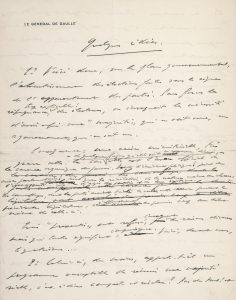 Quatrième République et proposant une réforme politique. Sous ce titre modeste de Quelques idées, de Gaulle a livré ses idées essentielles, et presque les grandes lignes de son futur programme de gouvernement. En même temps, il fait un bilan extrêmement sévère de la Quatrième République : le régime des partis n'a abouti qu'à affaiblir dangereusement la France, aussi bien sur le plan intérieur que dans le monde. L'argumentation est groupée en 8 points, que de Gaulle développe successivement, avec beaucoup de passion et un grand art du discours. Nous sommes en janvier 1953. De Gaulle, qui avait démissionné en 1946, se trouve en pleine "traversée du désert". Les élections viennent d'amener un gouvernement présidé par René Mayer, le dix-septième de la Quatrième République depuis 1945. Le cabinet René Mayer démissionnera au bout de quatre mois et demi, en mai 1953, justifiant les craintes exprimées ici par de Gaulle. De Gaulle constate tristement le résultat des élections faites sous le signe de l'apparentement des partis. Pour forcer la répugnance, trop explicable ! des électeurs, on invoquait la nécessité d'avoir enfin une "majorité" qui en soit une, un "gouvernement" qui en soit un. Conséquence : une crise ministérielle, très grave, celle-là. car elle est l'aveu officiel de la carence organique du pouvoir. Trois premiers ministres pressentis ont refusé, invoquant des raisons diverses, mais qui toutes signifient : impuissance. Voici, devant nous, le quatrième. [René Meyer]. Hélas, il n'a pas de programme susceptible de réunir une majorité réelle, c'est-à-dire compacte et résolue. Donc, les électeurs qui se sont laissés duper. qu'ils mesurent maintenant l'escroquerie politique dont eux-mêmes et le pays sont victimes ! Le pouvoir d'achat ? Il faudrait accroìtre la productivité par l'association substituée à la lutte des classes. Quant à la question scolaire, elle recouvre en fait le problème de l'éducation : C'est le progrès de l'éducation de la jeunesse française qu'il faut vouloir et favoriser. Ce sont les éducateurs, non les instructeurs, qu'il faut faire aider par les familles responsables de leur choix. Il en vient à la réforme de la Constitution, soulignant la malfaçon de celle en vigueur : Mais croit-on la réparer au moyen des infimes corrections qu'on nous propose ? C'est le système lui-même qui est à changer. C'est la séparation des pouvoirs qu'il faut, comme nous le voulons, nous, instituer aux lieu et place de cette confusion de tout à la discrétion des partis qui ont étouffé la République. Puis il déplore, en politique extérieure, ce lamentable et dangereux effacement de la France. C'est cette matière surtout, - la plus grave de toutes, - qui exige des pouvoirs publics capables de dégager l'intérêt national et de le faire passer au-dessus de toutes les clientèles et intérêts particuliers. C'est cela que nous voulons, nous, en contradiction complète avec le système exclusif des partis. Il s'adresse enfin directement à René Mayer : Vous valez mieux que cela. Vous avez été associé à de grandes choses, à de vastes réalisations. Pourquoi donc vous enfoncer maintenant dans les sables d'un système périmé. Que n'entendez-vous la voix que vous connaissez bien et qui appelle les hommes valables à s'assembler encore une fois par-dessus les clans et les partis. Il termine par un pathétique : Mais pourquoi perdre le temps et gaspiller les chances de la France ? MANUSCRIT DE PREMIER JET, comprenant de très nombreuses ratures et corrections. L'écriture, ferme et large, montre bien toute la continuité de la pensée politique du Général.