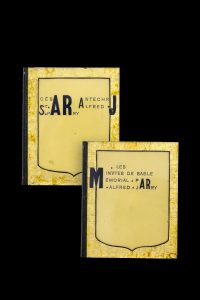 fond jaune, des titres dans leur composition typographique originale, en lettres noires, têtes noires, non rognés, couvertures et dos, étui (Mercher). Éditions originales, ornées de vignettes (9 et 14) en couleurs gravées sur bois par l'auteur. Un des 197 exemplaires sur vergé à la cuve. Reliure très réussie d'Henri Mercher, jouant avec la composition typographique de Jarry.