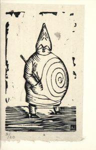 proche de celle du père Ubu, rayons dorés irradiant d'un ombilic central doré, doublure et gardes de daim vert bordé de box orange, tranches dorées sur témoins, couverture et dos, chemise demi-maroquin, étui (Paul Bonet, 1950). Édition originale. UN DES 15 EXEMPLAIRES SUR HOLLANDE, seul tirage en grand papier avec 5 Japon. Exemplaire portant cet ENVOI autographe signé au critique d'art et poète Gustave Kahn (1859-1936) : Exemplaire offert à Gustave Kahn, en grande admiration ancienne et récente Alfred Jarry Knocke-s-Mer 15 juin 96 On joint LE BOIS ORIGINAL D'ALFRED JARRY « Véritable portrait du Père Ubu » TIRÉ SUR JAPON, NUMÉROTÉ 9/20, reproduit en frontispice et sur la couverture de l'ouvrage. Reliure de Paul Bonet, décrite dans ses Carnets (n° 902), avec ce commentaire, qui renvoie à une autre reliure de la même année et de même inspiration (n° 897) : Le nombril du Père Ubu : centre du monde.