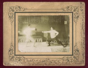 [Jarry (Alfred)]. Photographie originale. 16 x 11 cm, sous verre, cadre de velours. Rare photographie d'Alfred Jarry prise à Laval, dans la salle d'Armes de M. Blaviel pendant l'été 1906. Elle porte cette dédicace autographe signée : A Rachilde...
