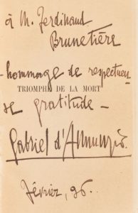 ANNUNZIO Gabriele d' Triomphe de la mort. Calmann Lévy éditeur Paris 1896. E.O. L'un des 50 ex. sur Hollande, seul grand papier annoncé, celui-ci n°112. Envoi autographe signé et daté «février 96» à l'historien et critique littéraire : «à M. Ferdinand Brunetière, hommage de respectueuse gratitude». Reliure in-12 demi maroquin rouge à coins, dos à 5 nerfs et légèrement insolé, caissons ornés de dorures, date en pied, tête dorée, couvertures et dos conservés, ex-libris de Georges Degryse.