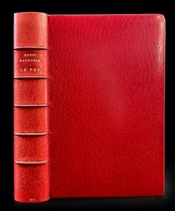 BARBUSSE Henri Le feu (Journal d'une escouade). Flammarion Paris 1916. E.O. L'un des 165 ex. sur Hollande, seul grand papier après 33 Japon, celui-ci n°106 paraphé par l'éditeur. Reliure in-12 plein maroquin rouge, dos à 5 nerfs, lettrines or et date en pied, dos très légèrement éclairci et une piqûre en bordure du deuxième caisson, trois tranches dorées, contre-plat à encadrement de liserés or, couvertures et dos conservés, ex-libris de Georges Degryse, étui (reliure signée Duhayon).