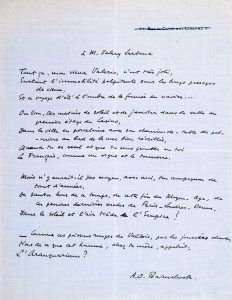 INTÉRESSANT MANUSCRIT D'UN POÈME DE BARNABOOTH QUI NE FUT PUBLIÉ QU'EN 1922. En 1908, Larbaud avait publié les Poèmes par un Riche Amateur, où apparaissait la figure, très originale, de Archibald Olson Barnabooth, jeune milliardaire sud-américain, voyageur cosmopolite et poète. En 1913, il reprendra ce personnage, pour en faire le héros du Journal de A. O. Barnabooth. Son cosmopolitisme ironique et son amour de la poésie se retrouvent bien ici dans ce poème plus tardif, à la fois familier et noble, et qui, autre ironie, est dédié à M. Valery Larbaud : Tout ça, mon vieux Valerio, c'est très joli, Surtout l'immobilité palpitante sous les longs passages de cieux, Et ce voyage d'été à l'ombre de la fumée du navire. Ou bien, ces matins de soleil et de janvier dans la salle du premier étage du Casino, Dans la ville en porcelaine avec son chemin-de-table de palmiers au bord de la mer bien réveillée. Et l'esprit de Barnabooth inspire aussi la pirouette finale, souvenir autobiographique de Larbaud : - Comme ces poissons rouges de Valbois, par les journées chaudes Hors de ce que cet homme, chez ta mère, appelait : L'Arauquarium ? Ce poème fut publié dans le n° spécial consacré à Valery Larbaud de la revue Intentions (nov. 1922, p. 57). Il sera recueilli en volume dans l'édition clandestine de Dévotions particulières (Stols, 1941). Il montre combien le personnage et l'esprit de Barnabooth avaient continué à hanter Larbaud. Texte conforme à l'imprimé (luvres, Pléiade, p. 1109).
